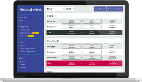 - Summaries for income, expenses, budgeted amounts, and bank account balance